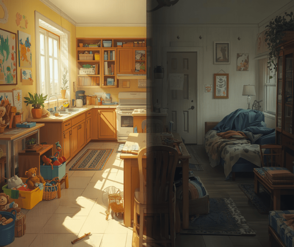 The kitchen has finger paintings and the residue from yesterday’s lesson
